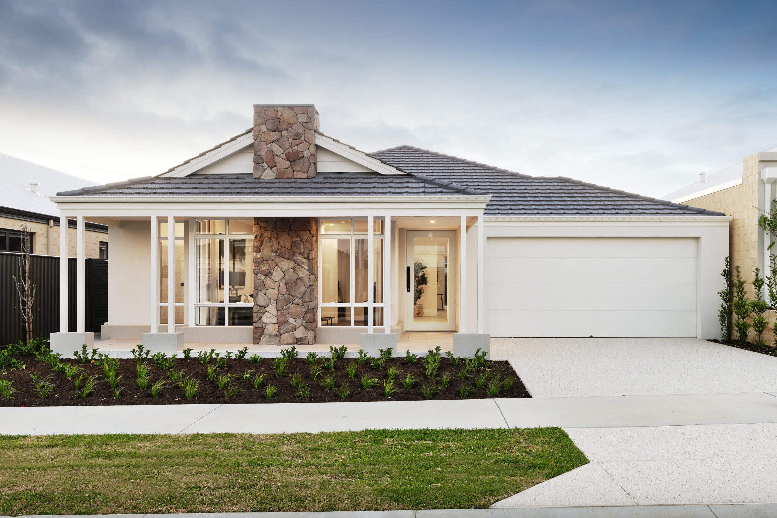 Crisp whites and neutral greys provide the backdrop to a stunning stone pier which is undoubtedly the centerpiece of this elegant Contemporary style home. When you step inside this 4-bedroom, 2-bathroom home, you’ll be delighted to see the high ceilings and an abundance of light from the windows and skylights in the open plan living area. This cleverly designed floorplan will appeal to families with kids both young and old. The rear of the home has everything the kids need – a place to rest, play and study, with handy access to the backyard. Cooking meals is a breeze in this house with a fully equipped kitchen, scullery and walk-in pantry, sure to please any budding chef. The master suite and home theatre at the front of the home provide a nice quiet place to retreat at the end of a long day.