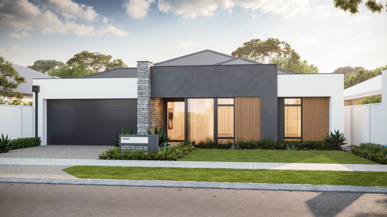 • The striking façade of the Soho Contemporary Luxe features a mix of cladding, contrasting render and feature stone. The effect is a stylish, modern four-bedroom home perfect for family living.